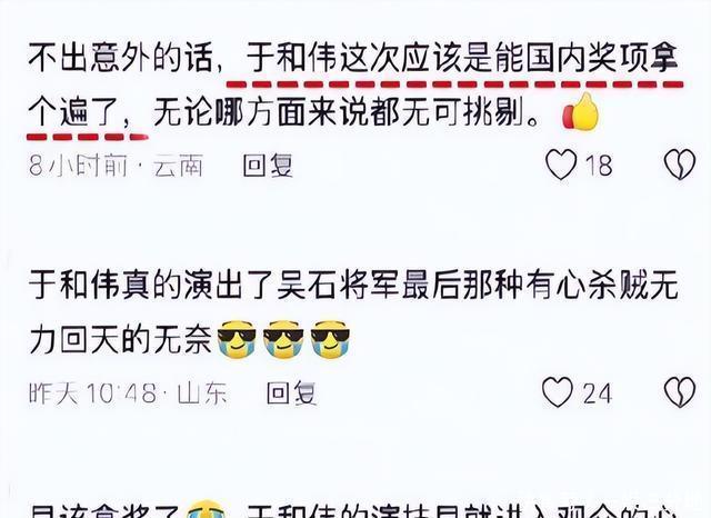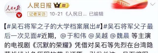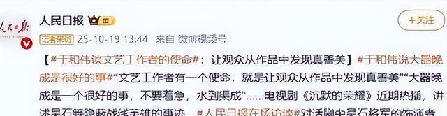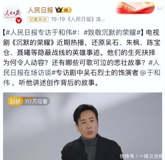第一次是10月19日,人民日报发文章夸了他曾经演过的剧《沉默的荣耀》,还在文章中提到于和伟曾经说过的一句话“大器晚成是很好的事”,也讲了他在剧中的表演。 说他把角色演“活”了,让历史人物有了温度等等,相信看过这部剧的人应该对他的表演印象很深吧。
